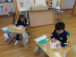 1年生の生活科の時間です。来週に予定している、明和保育所さくら組さんとの交流会の準備を一生懸命に行っています。