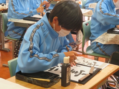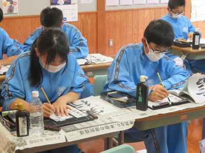 1年生は文化祭で展示する作品に取り組んでいました。「実行」の文字を手本を参考に、止め・はねを意識しながら集中して筆を動かしていました。文化祭当日、子どもたちの作品がたくさん飾られますので、ご覧頂ければと思います。