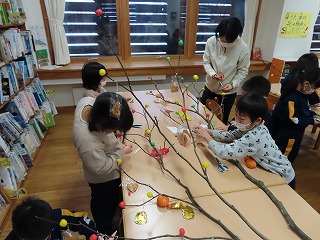 1年生の児童が、先週行った「団子さし」の片付けを行っています。伝統行事に触れるだけでなく、準備から片付けまできちんと行うことで、責任をもってやり遂げる力も身につけさせていきます。
