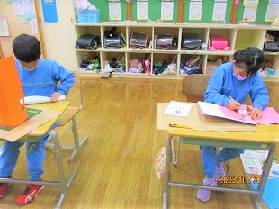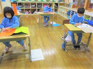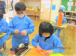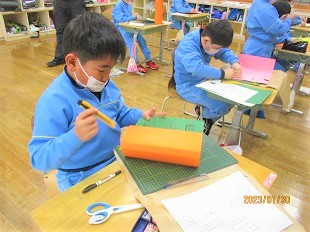 2年生の図工では色画用紙を使って作品づくりに励んでいました。アイデアを形にしようと熱心に取り組んでいました。