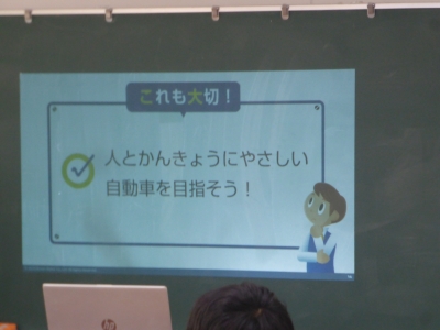 社会科では、「自動車」を通して工業について学んでいます。今日は未来の自動車という視点で学習を進めていました。環境に配慮するということはESD教育にもつながるね。