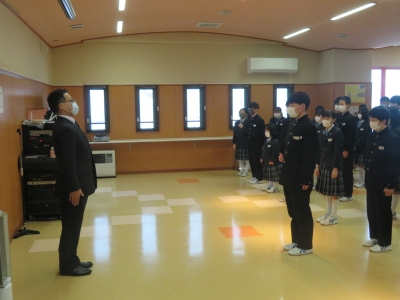 朝、多目的ホールにおいて、全校朝会が行われました。