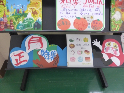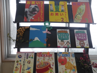 1月の職員室前図書コーナーの様子です。お正月にちなんだ本だけでなく、コミュニケーションに関わる楽しい本が飾られています。子どもたちは興味のある本を手にして眺めています。