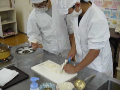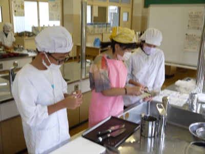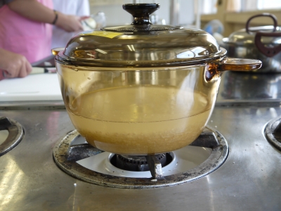 何やら家庭科室からも楽しそうな声が聞こえてきたので、のぞいてみますと5年生が「御飯と味噌汁」を作る調理実習を行っていました。