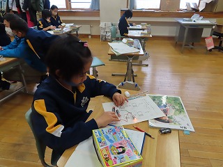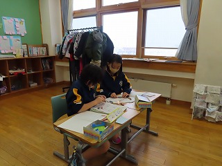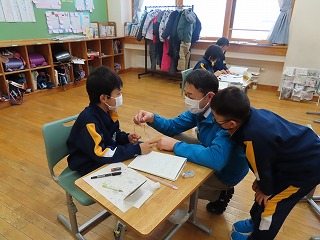 3学年理科「明かりをつけよう」の学習の様子です。この時間の問題は「豆電球とかん電池をどのようにつなぐと明かりがつくのだろうか。」です。子ども達は、まず、明かりがつくつなぎ方を考えて、図に描きました。そして、豆電球とかん電池をつないで、確かめました。
