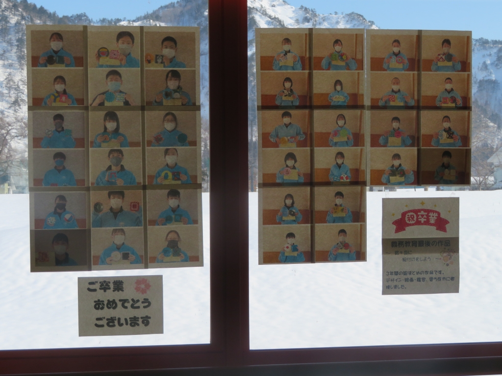 昇降口前には、3年生が美術で作った作品が写真として掲示されています。